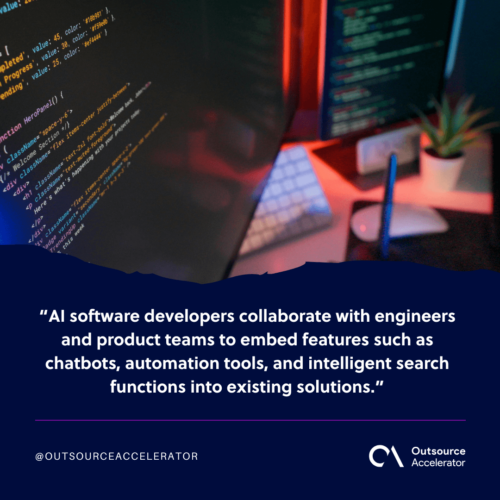 AI software developers collaborate with engineers and product teams to embed features such as chatbots, automation tools, and intelligent search functions into existing solutions. Their work brings AI functionality directly into everyday business tools.