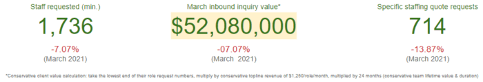*Conservative client value calculation: take the lowest end of their role request numbers, multiply by conservative top-line revenue of $1,250/role/month, multiplied by 24 months (conservative team lifetime value & duration)