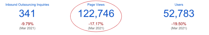 The Outsource Accelerator platform saw a slight dip in outsourcing traffic again for April. There is a downward trend in visits and inquiries, since the enthusiastic peak of the ‘new year’. However, despite the lower traffic in April, it still generated 52,783 site visitors, 122,746 page views and 341 inbound inquiries.