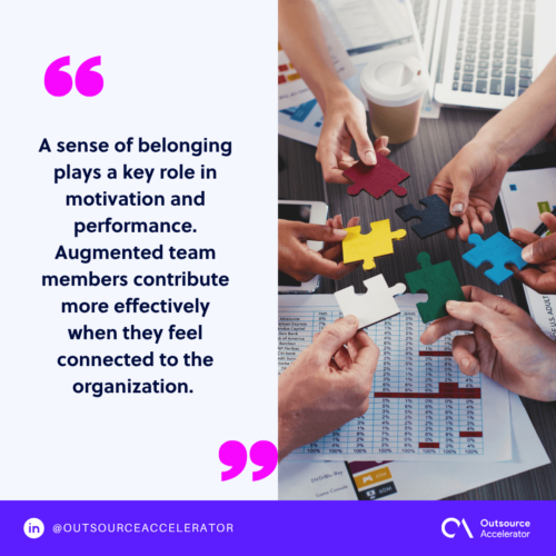 A sense of belonging plays a key role in motivation and performance. Augmented team members contribute more effectively when they feel connected to the organization.