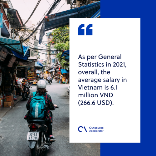 As per General Statistics in 2021, overall, the average salary in Vietnam is 6.1 million VND (266.6 USD).