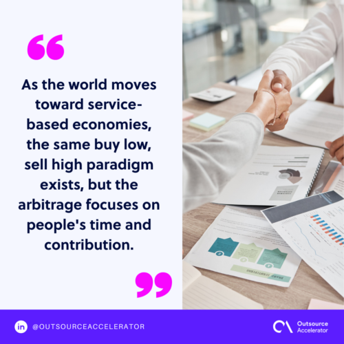 As the world moves toward service-based economies, the same buy low, sell high paradigm exists, but the arbitrage focuses on people’s time and contribution. Companies hire staff at one rate, package their production, and sell it at another, higher rate.