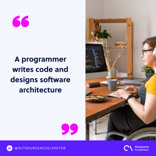 A programmer writes code and designs software architecture. They create the structure and logic behind programs.