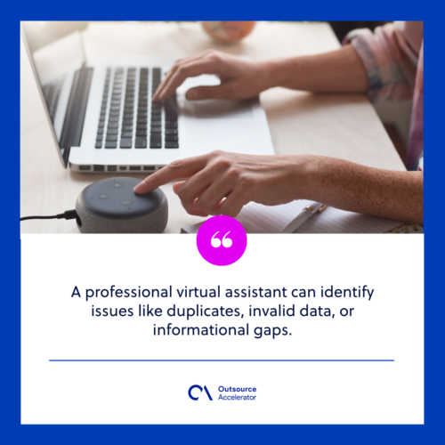 A professional virtual assistant can identify issues like duplicates, invalid data, or informational gaps. Data directly impacts earnings. According to Validity’s survey, 44% of companies estimate a 10% loss in annual revenue due to data decay.
