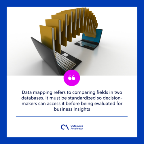 Data mapping refers to comparing fields in two databases. Data must be standardized so decision-makers can access it before being evaluated for business insights.