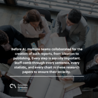 Before AI, multiple teams collaborated for the creation of such reports, from ideation to publishing. Every step is equally important. Staff comb through every sentence, every statistic, and every chart in these research papers to ensure their veracity.