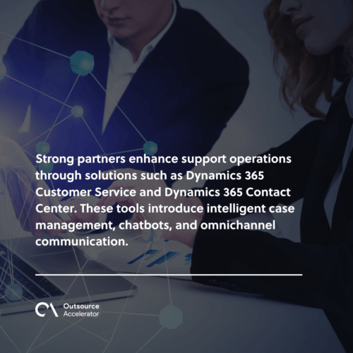 Strong partners enhance support operations through solutions such as Dynamics 365 Customer Service and Dynamics 365 Contact Center. These tools introduce intelligent case management, chatbots, and omnichannel communication.