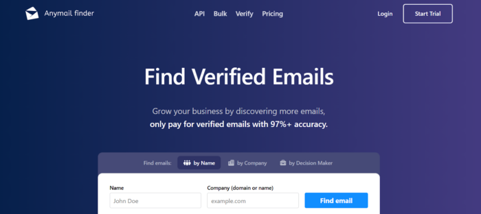 Anymail Finder is known for a pay-only-for-verified approach that’s attractive for bounce-averse teams. It supports single, bulk, and API lookups.