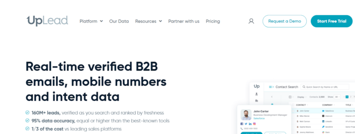 | UpLead | Real-time verification, 50+ filters, CRM sync | Tiered pricing; contact sales for details | Precise B2B filters and enrichment |