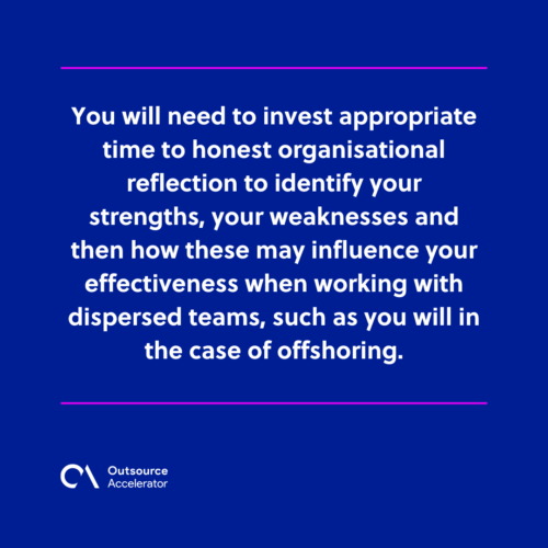 To answer these questions effectively, you will need to invest appropriate time to honest organisational reflection to identify your strengths, your weaknesses and then how these may influence your effectiveness when working with dispersed teams, such as you will in the case of offshoring.