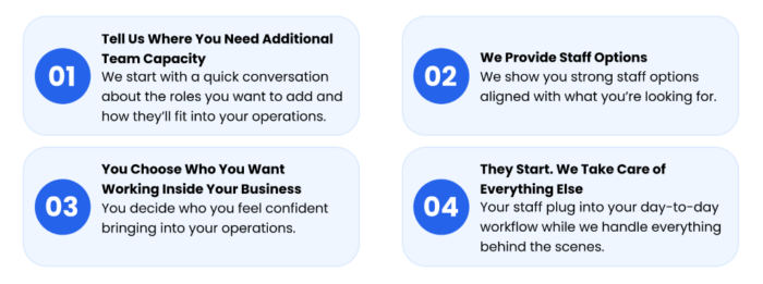 - Seamless Integration: Staff members plug directly into your business and follow your existing daily workflows.