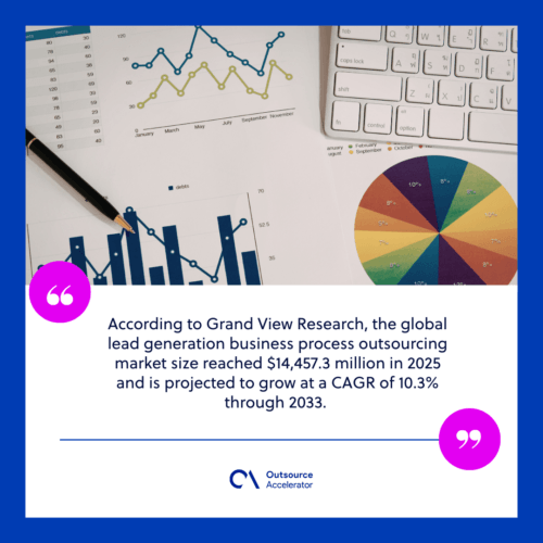 Market data reflects this rising demand. According to Grand View Research, the global lead generation business process outsourcing market size reached $14,457.3 million in 2025 and is projected to grow at a CAGR of 10.3% through 2033
