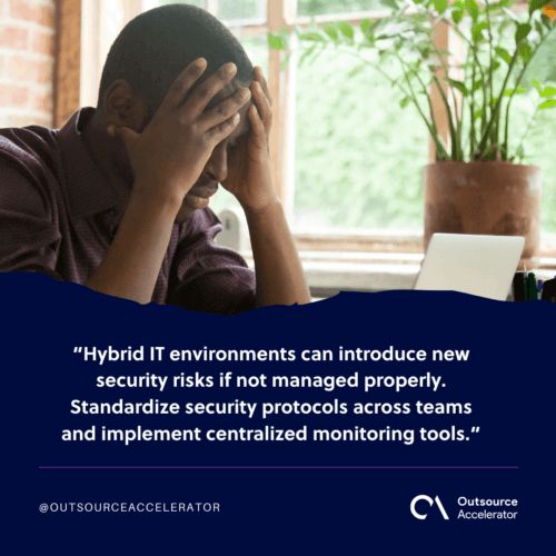 Hybrid IT environments can introduce new security risks if not managed properly. Standardize security protocols across teams and implement centralized monitoring tools.