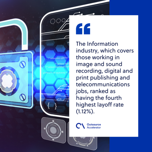 The Information industry, which covers those working in image and sound recording, digital and print publishing and telecommunications jobs, ranked as having the fourth highest layoff rate (1.12%). Other services, which encompasses professions such as equipment and machinery repair, dry cleaning or laundry services, providing personal and pet care, grantmaking and promoting religious activities, ranked fifth (1.06%).