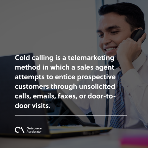 Cold calling is a telemarketing method in which a sales agent attempts to entice prospective customers through unsolicited calls, emails, faxes, or door-to-door visits.