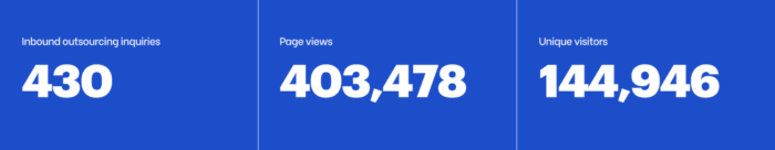 From this traffic, the Source Partner platform generated 430 inquiries across 21 countries and 29 sectors. Of these, 408 were unique quote requests, representing 780 full-time employees and an estimated outsourcing value of $23,400,000.