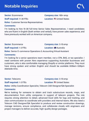 In January, Outsource Accelerator averaged nearly 15 inbound outsourcing inquiries per day. Out of the 430 inquiries, 408 were requests for quotations. Here are six notable examples: