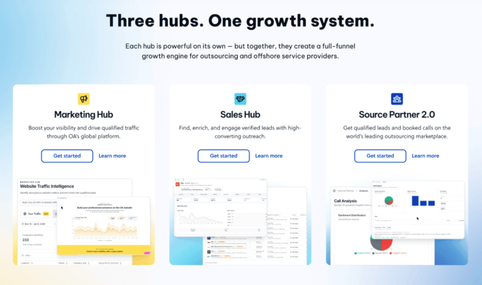 The Outsource Accelerator Hubs is the world’s most comprehensive marketing, sales, and business intelligence platform for the outsourcing industry. Whether you need: