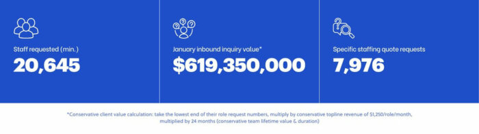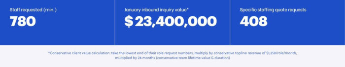 *Conservative client value calculation: Take the lowest end of their role request numbers, multiply by conservative top-line revenue of $1,250/role/month, multiplied by 24 months (conservative team lifetime value & duration)