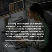 Devoting uninterrupted hours to work allows staff to be completely engrossed in their deliverables. It enables them to discover critical nuances and unlock ideas that otherwise wouldn’t have been possible if they kept leaving their desks every few minutes.