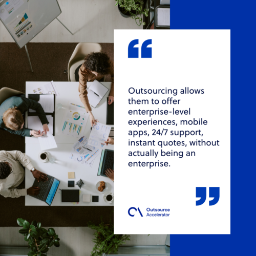 Outsourcing allows them to offer enterprise-level experiences, mobile apps, 24/7 support, instant quotes, without actually being an enterprise.
