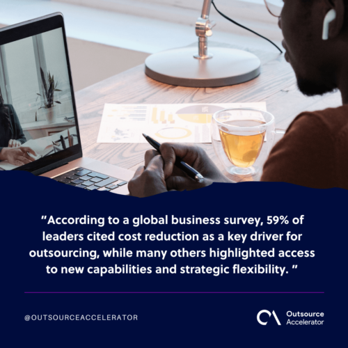 According to a global business survey, 59% of leaders cited cost reduction as a key driver for outsourcing, while many others highlighted access to new capabilities and strategic flexibility.