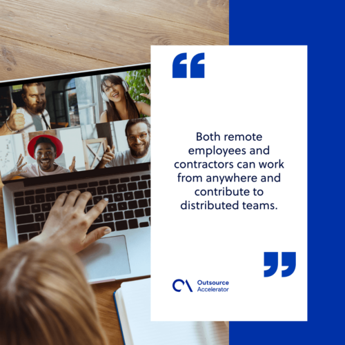 Key takeaway: Remote employees support sustainable, culture-driven growth strategies. On the other hand, contractors offer agility and specialized skill access without long-term commitment.
