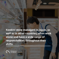 Konbini store managers in Japan, as well as in other countries, often work alone and have a wide range of responsibilities throughout their shifts. They man the register, mop the floors, restock coolers and shelves, and perform basic accounting tasks. It’s standard practice for these workers to punch in well over 40 work hours per week.
