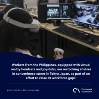 Outsourcing and the combination of humans and technology may be the new lifeblood of convenience stores and their employees. Workers from the Philippines, equipped with virtual reality headsets and joysticks, are restocking shelves in convenience stores in Tokyo, Japan, as part of an effort to close its workforce gaps.