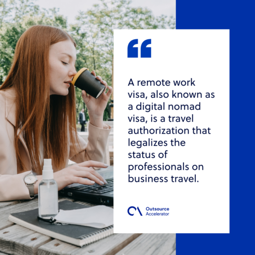 A remote work visa, also known as a digital nomad visa, is a travel authorization that legalizes the status of professionals on business travel.