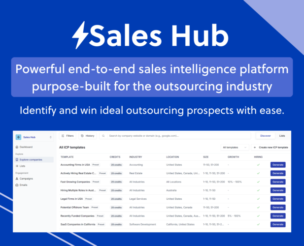 Finding the right outsourcing leads at the right time is one of the toughest challenges for providers. That’s why Outsource Accelerator built the Source Partner Sales Hub—a powerful end-to-end sales intelligence platform designed exclusively for the outsourcing industry.