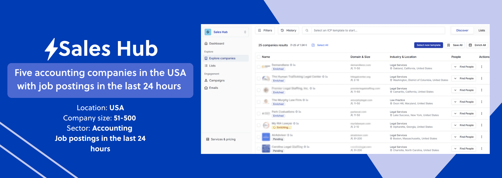 With Sales Hub, your team can stop chasing cold leads and instead focus on high-potential companies that are actively hiring and growing. The platform combines deep business intelligence with automated prospecting tools, helping you uncover opportunities faster and move them through your pipeline with confidence.