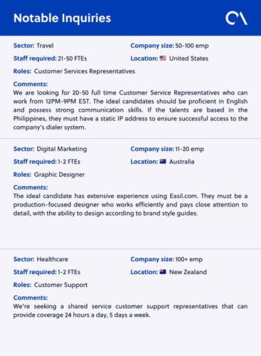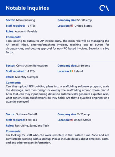 In September, Outsource Accelerator averaged nearly 20 inbound outsourcing inquiries per day. Out of the 599 inquiries, 565 were requests for quotations. Here are six notable examples: