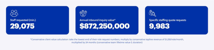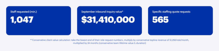 *Conservative client value calculation: Take the lowest end of their role request numbers, multiply by conservative top-line revenue of $1,250/role/month, multiplied by 24 months (conservative team lifetime value & duration)