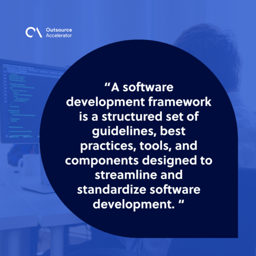 A software development framework is a structured set of guidelines, best practices, tools, and components designed to streamline and standardize software development.