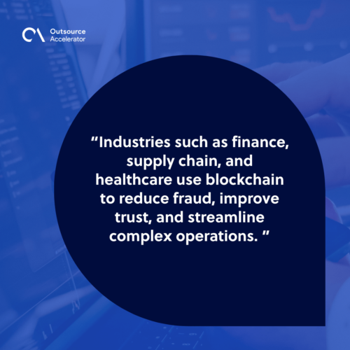 Industries such as finance, supply chain, and healthcare use blockchain to reduce fraud, improve trust, and streamline complex operations.