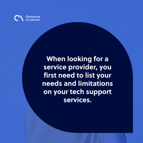 When looking for a service provider, you first need to list your needs and limitations on your tech support services. Being crystal clear about your needs will make the search for the perfect cloud staffing agency easier and smooth sailing.