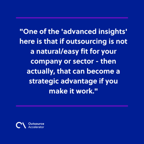 One of the ‘advanced insights’ here is that if outsourcing is not a natural/easy fit for your company or sector – then actually, that can become a strategic advantage if you make it work. It can be your moat. “The obstacle is the way.”
