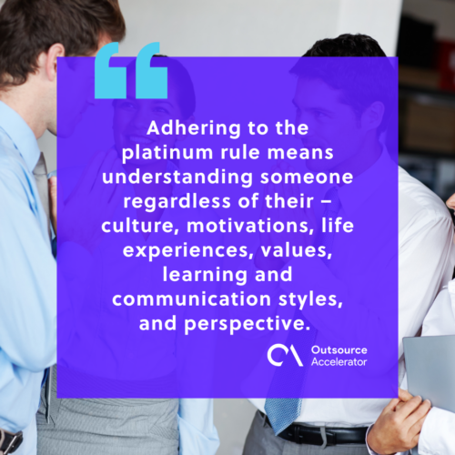 Adhering to the platinum rule means, for whatever strange reason, understanding a person regardless of the – culture, motivations, life experiences, values, learning and communication styles, and perspective.