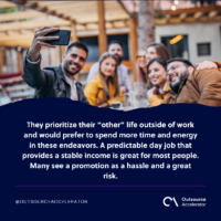 Not everyone is willing to manage a team, be on call 24/7, sit in meetings all day, or hop on a new learning curve. For these workers, a 9-5 is a means to fund a certain lifestyle. They prioritize their “other” life outside of work and would prefer to spend more time and energy in these endeavors. A predictable day job that provides a stable income is great for most people. Many see a promotion as a hassle and a great risk.