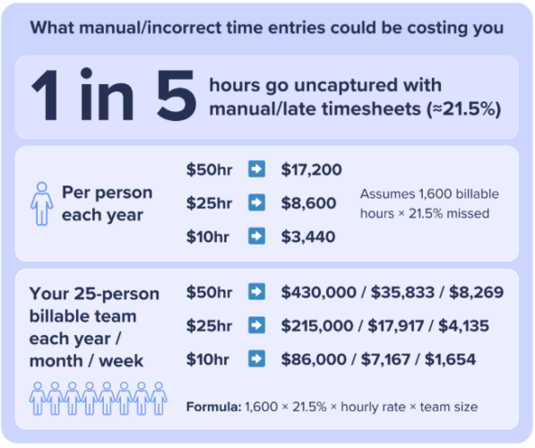 That translates to $51,000–$64,000 lost per billable employee every year—all from time that should have been captured but wasn’t.