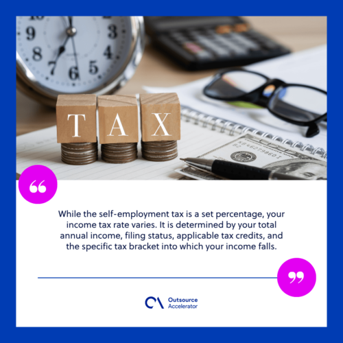 While the self-employment tax is a set percentage, your income tax rate varies. It is determined by your total annual income, filing status, applicable tax credits, and the specific tax bracket into which your income falls.