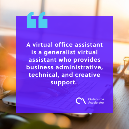 A virtual office assistant is a generalist virtual assistant who provides business administrative, technical, and creative support.
