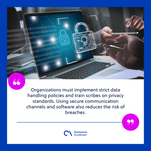 Discussing patient information on unsecured platforms or failing to follow HIPAA protocols can expose businesses to legal risks. To prevent this, organizations must implement strict data handling policies and train scribes on privacy standards.