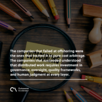 It didn’t work. The companies that failed at offshoring were the ones that treated it as pure cost arbitrage. The companies that succeeded understood that distributed work requires investment in governance, oversight, quality frameworks, and human judgment at every layer. You don’t hand a team in Manila or Bangalore a production system and walk away any more than you should hand an AI agent one.