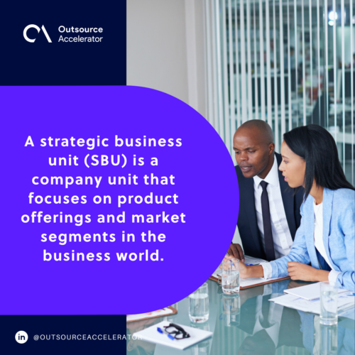 A strategic business unit (SBU) is a company unit that focuses on product offerings and market segments in the business world. They may be part of a more prominent company organization. SBUs often have their marketing plan, competitor analysis, and marketing campaigns.