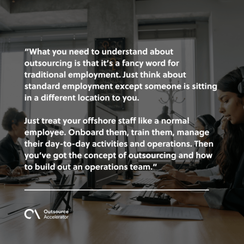 Just treat your offshore staff like a normal employee. Onboard them, train them, manage their day-to-day activities and operations. Then you’ve got the concept of outsourcing and how to build out an operations team.”
